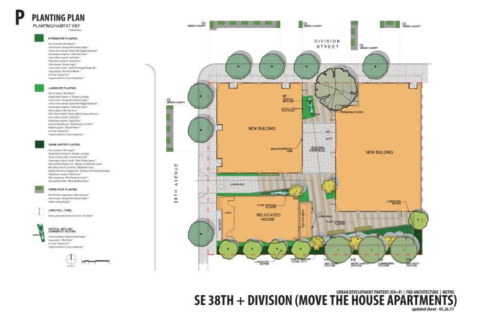 The Move the House Site achieved a total of 93.5 points to garner the highest Platinum rating in LEED for Homes. This site is a mixed use project in Portland design by Francis Dardis of STACK Architecture for Portland developer Urban Development Partners. The site relocated a house (thus the name) and included apartments atop retail space in two buildings connected by a skybridge. The site spaces that remain include a range of sustainable site features woven through the remaining spaces.