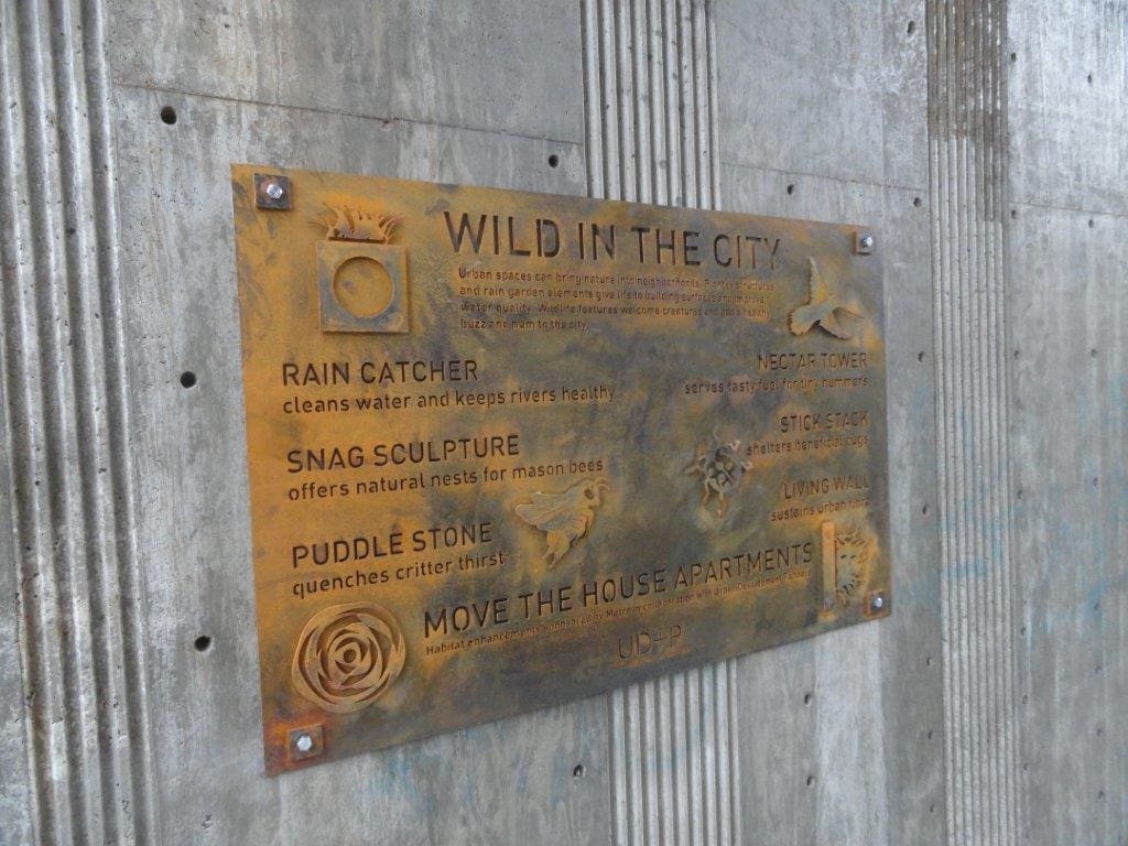 A grant from Metro provided some additional habitat friendly elements (sculptures, snags, insect habitat, areas for mason bees, and hummingbird feeders), along with signage describing the ‘Wild in the City’ elements. The incorporation of whimsical elements is not a prerequisite of LEED, but the desire to create places, not just sites, drives all of our design concepts.